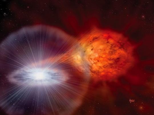 Fantáziakép egy "klasszikus" Ia szupernóva felrobbanásáról. Úgy tűnik, a fehér törpék végső robbanásáról alkotott összkép jóval árnyaltabb, mint korábban gondoltuk.