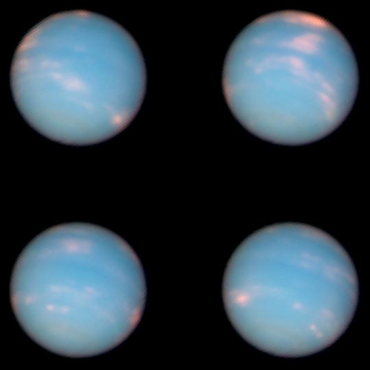 A Hubble Űrteleszkóp WFC3 kamerájával 2011. június 25/26-án a Neptunuszról készült felvételek. A képek közti különbség durván 4 óra, így a négy felvételen a körülbelül 16 órás tengelyforgási periódusú bolygó teljes egészében megfigyelhető. A légkör jellegzetes alakzatai a metánjégből álló, nagy magasságban elhelyezkedő felhők.