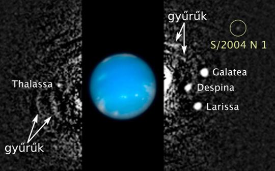 A Neptunusz gyűrűrendszerének és a holdjainak fekete-fehér felvétele a Hubble űrteleszkóp WFC3 (Wide Field Camera 3) műszerével készült 2009-ben. A képen körrel megjelölve jól látható az új, S/2004 N 1 jelzéssel ellátott holdacska. A bolygó középre montírozott színes képét szintén a Hubble készítette 2009. augusztus 19-én.