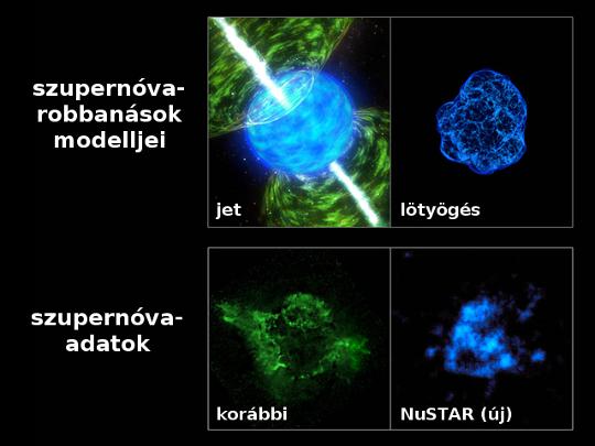 A felső sor képei a szupernóva-robbanás jet-modelljét, illetve a mag lötykölődését feltételező modellt mutatják. Az alsó sorban a Cas A korábbi röntgenképe (balra) és a titán 44-es izotópja NuSTAR által mért röntgensugárzásának eloszlása látható.