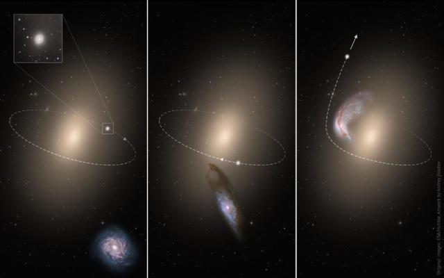 A sematikus ábra egy szökevénygalaxis létrejöttét mutatja. Az első panelen a "behatoló" spirálgalaxis megközelíti a galaxishalmaz centrumát, ahol egy kompakt elliptikus galaxis (cE) kering egy nagy elliptikus galaxis körül. A középső panelen a szoros megközelítés miatt a kompakt elliptikus galaxis kap egy gravitációs "löketet" a behatolótól. A harmadik panelen a kis galaxis elhagyja a halmazt, miközben a centrumban található óriási elliptikus galaxis elkezdi bekebelezni a behatolót.