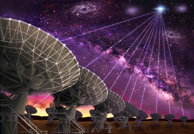 A rádiókitörés pozíciójának legpontosabb meghatározására használt Arecibo rádiótávcső és az Európai VLBI Hálózat fantáziaképe.